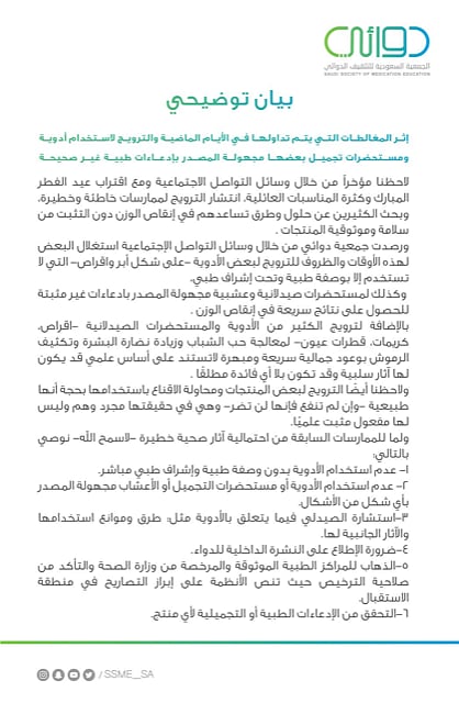 حذَّرت الجمعية السعودية للتثقيف الدوائي"دوائي"عبر بيان أصدرته من المعلومات المغلوطة التي تم تداولها مؤخرًا حول وجود إبر لإنقاص الوزن ومستحضرات تجميل من مصادر مجهولة بادعاءات طبية غير صحيحة ؛ وذلك بهدف الحصول على نتائج تجميلية سريعة قبل العيد ؛ ما قد يعكس ضرره.